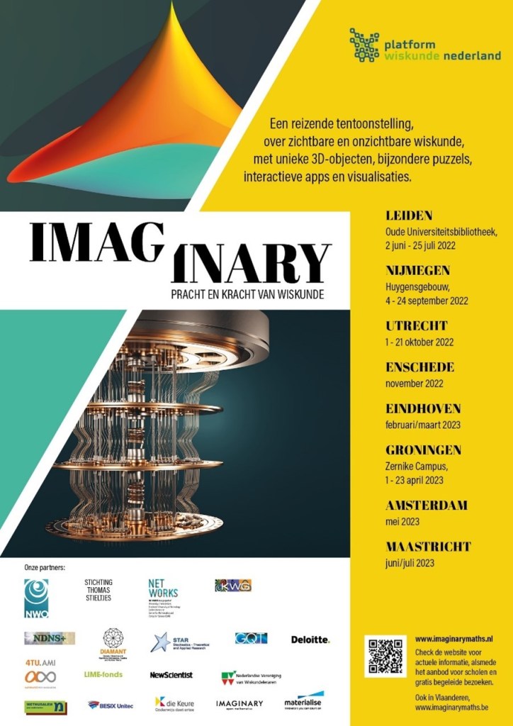 Deze nieuwe IMAGINARY tentoonstelling in Nederland wordt georganiseerd door Platform Wiskunde Nederland in samenwerking met Nederlandse universiteiten en ondersteund door partnerorganisaties. De tentoonstelling loopt gelijktijdig in Vlaanderen, waar het Platform Wiskunde Vlaanderen de drijvende kracht is. Gedurende het gehele schooljaar 2022-2023 kan “IMAGINARY: pracht en kracht van wiskunde” bezocht en beleefd worden. Op elke locatie komen gratis rondleidingen voor schoolklassen en andere belangstellenden. De tentoonstelling omvat talrijke topkwaliteit-posters, een reeks 3D-objecten, puzzelopstellingen en meerdere interactieve apps waar je als bezoeker mee aan de slag kunt gaan via grote touchscreens. Wiskunde: verrassend divers, aansprekend mooi en verbluffende toepassingen!